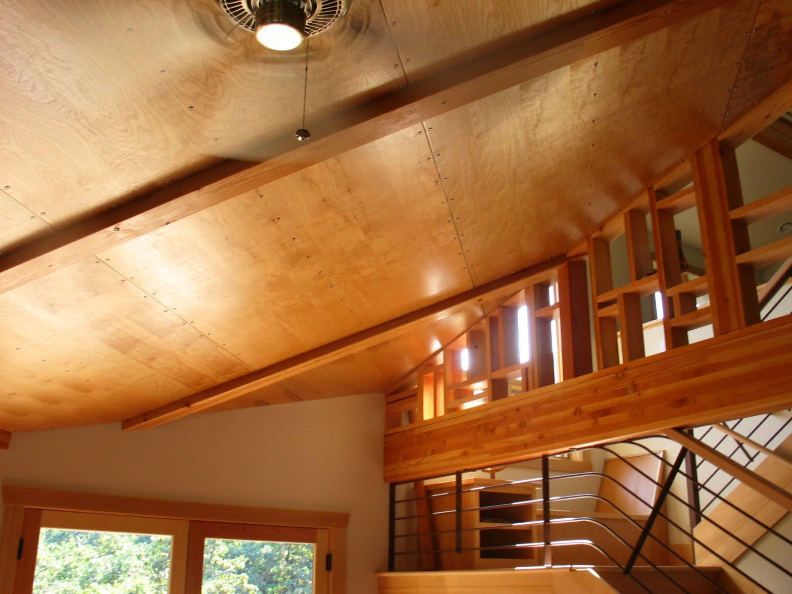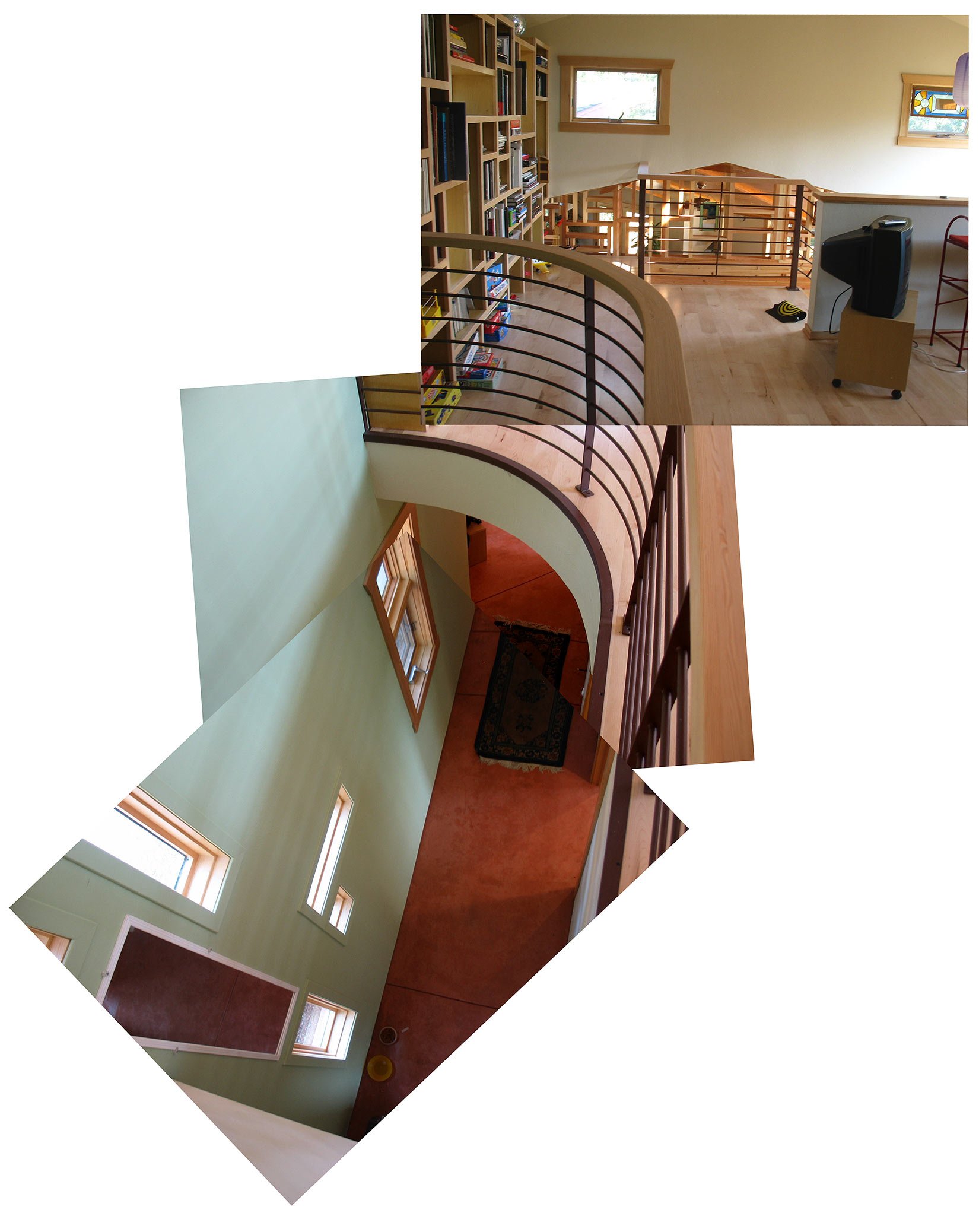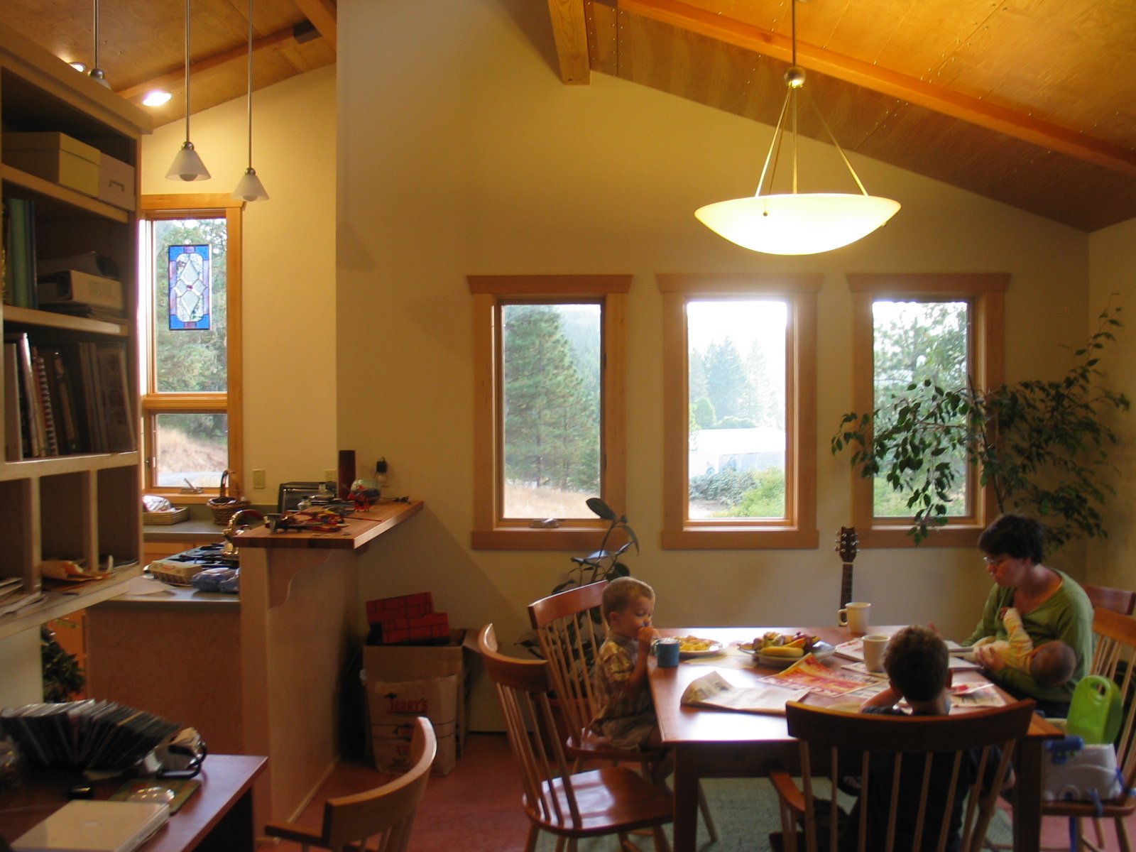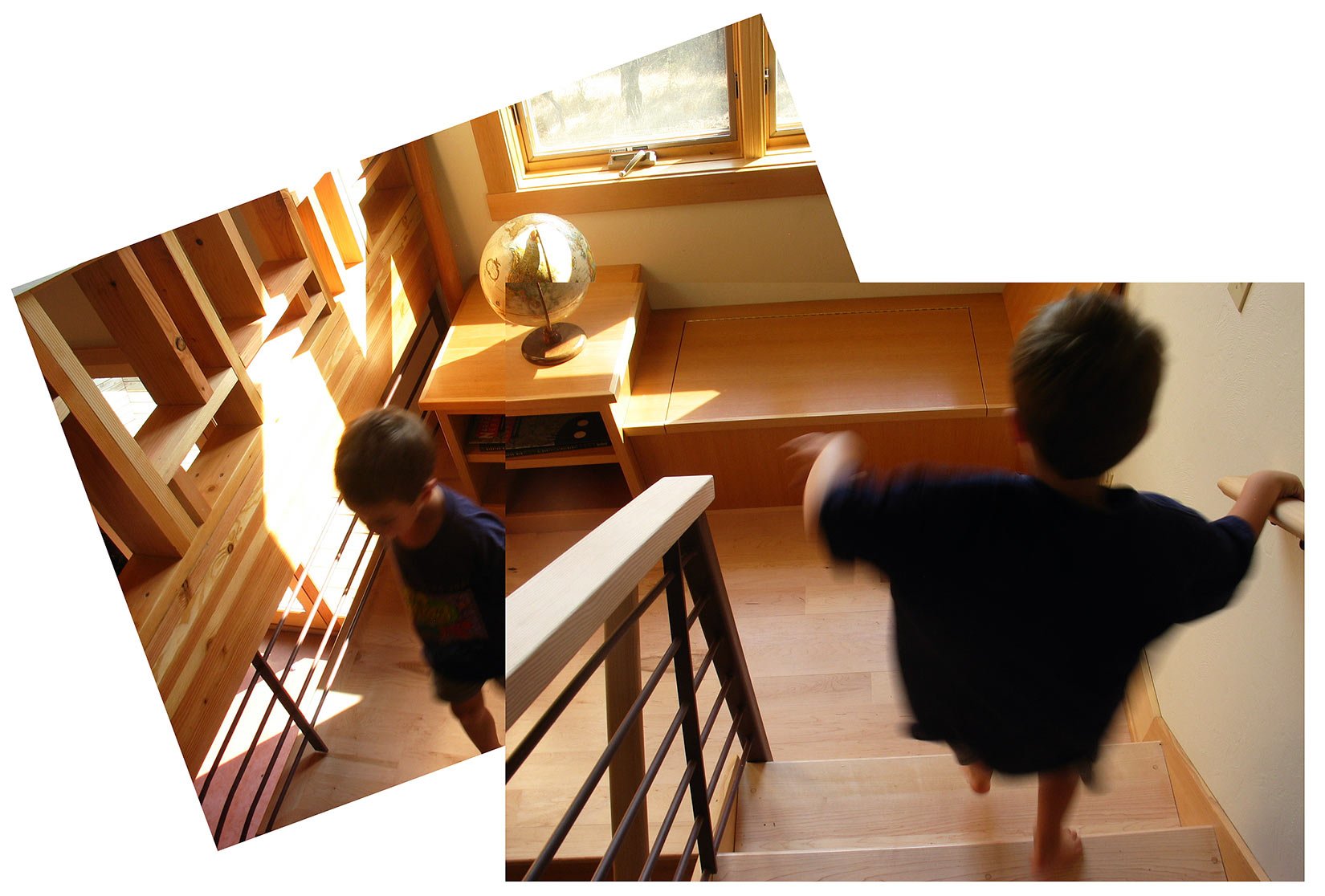 This 2,263 sq. ft. four bedroom, two bath, passive-solar house was designed for a couple and their three kids to be “the opposite of shock and awe.” The clients wanted their house to branch out to their surroundings, balancing their desire for sustainability with a simple yet graceful aesthetic. The vaulted kitchen, living, and dining rooms are part of an open landscape that spills outdoors to the wrap-around deck, and inside to the entry, open stairwell, and upper landing. The heart of the house is an in-between space found at the intermediate landing of the stairs. Clerestory windows provide daylight deep within the house, and promote a system of natural ventilation. The main floor consists of approximately 1,600 sq. ft. of thermal mass, a concrete radiant slab that’s heated by a geothermal heat pump; the color is a warm earth-tone that compliments the maple cabinetry in the kitchen and hard wood floors upstairs. Two solar panels provide most of the domestic hot water needs of the household. A heat recovery ventilator in the basement provides for fresh, healthy indoor air within the super-insulated house.