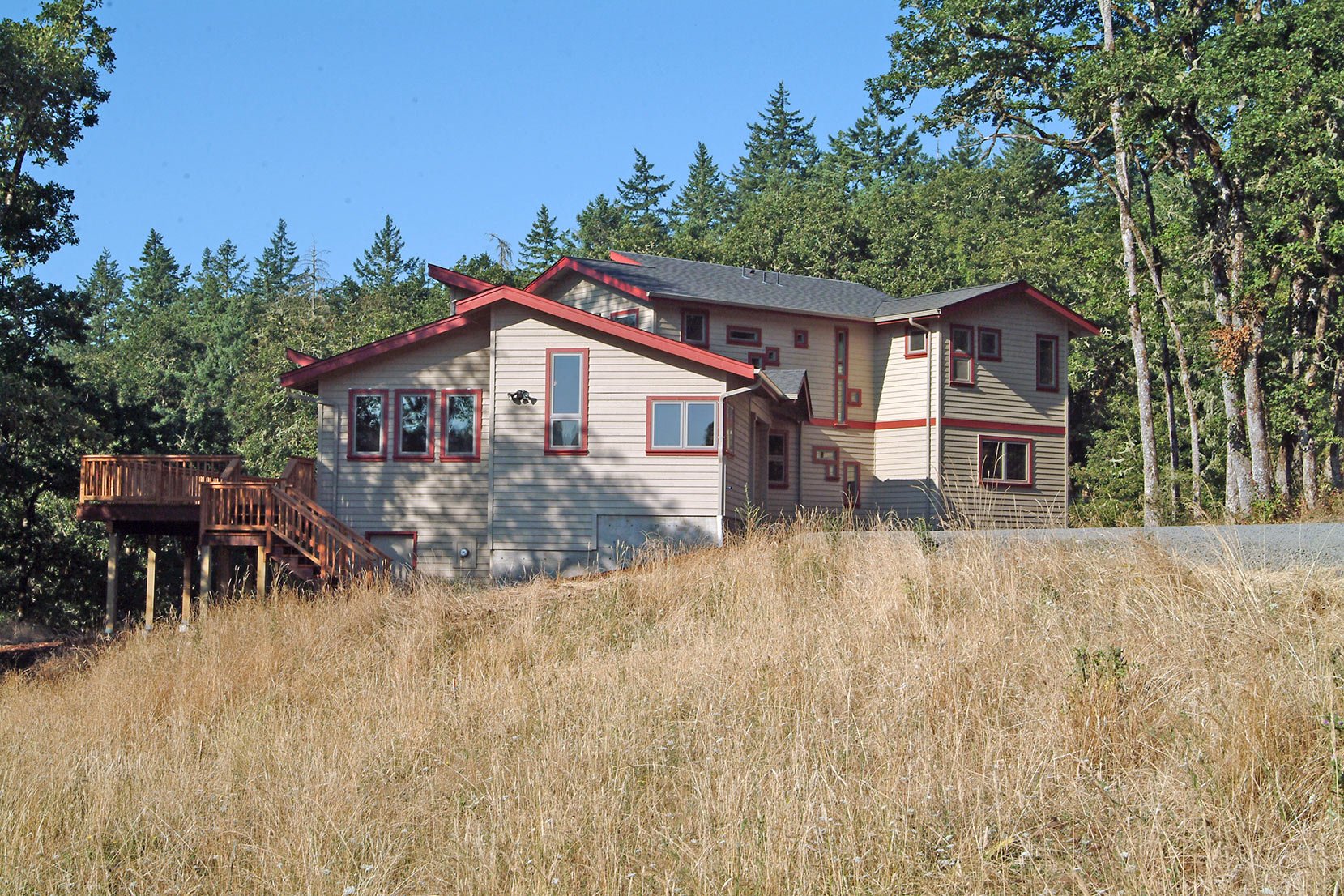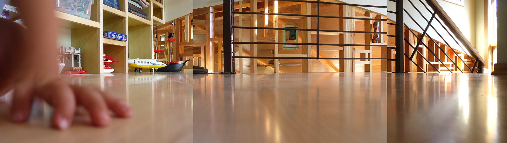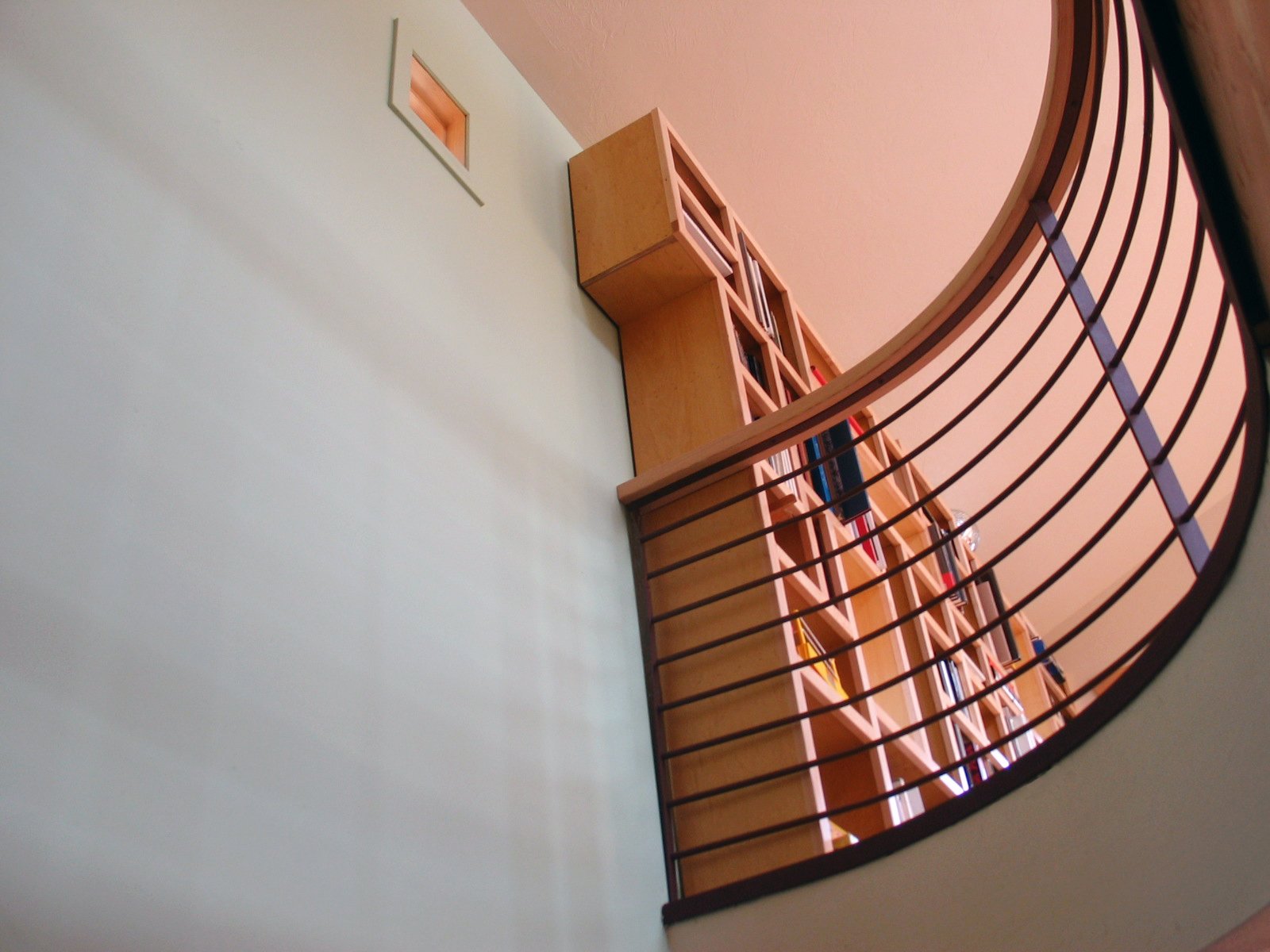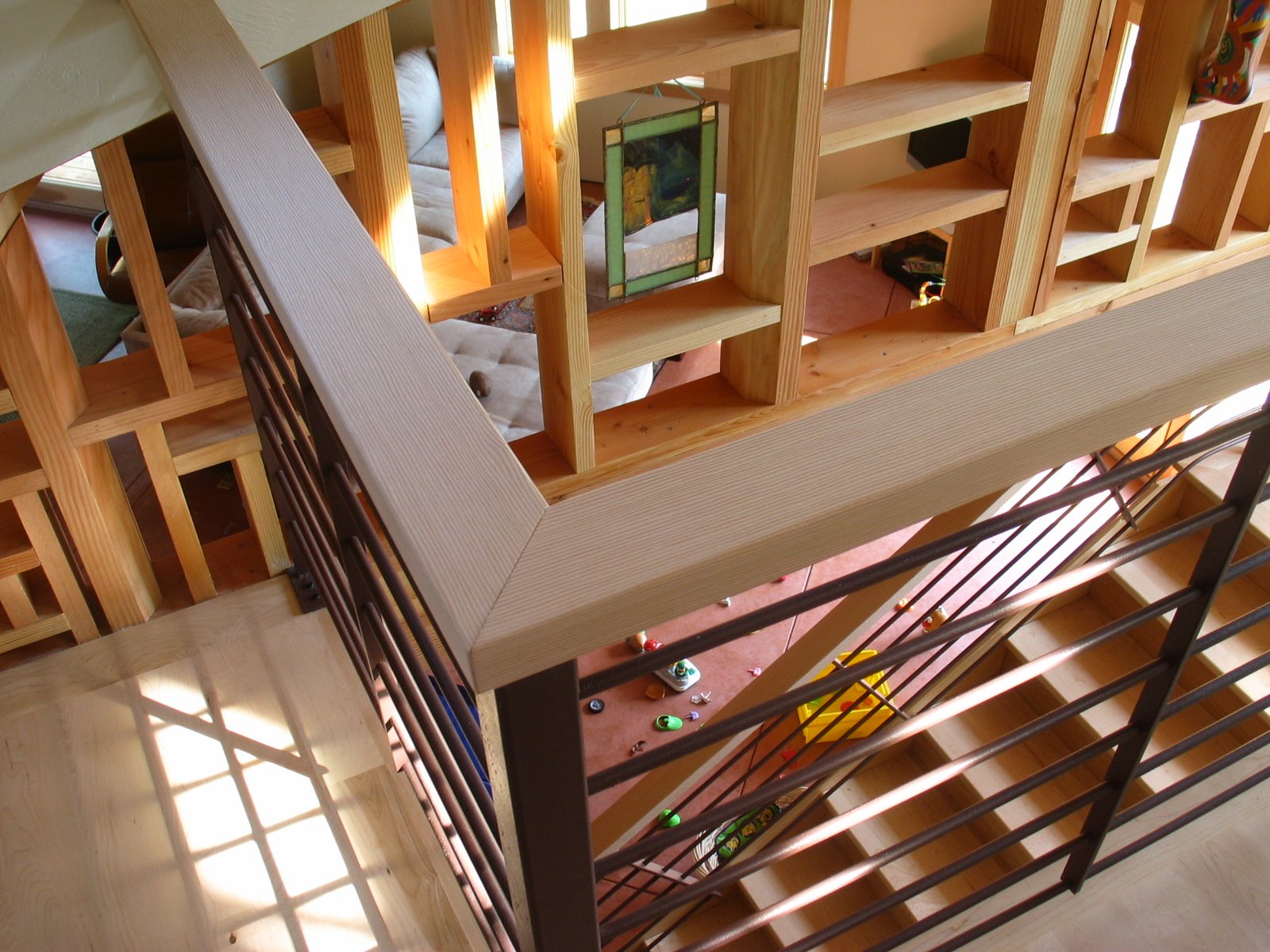 This 2,263 sq. ft. four bedroom, two bath, passive-solar house was designed for a couple and their three kids to be “the opposite of shock and awe.” The clients wanted their house to branch out to their surroundings, balancing their desire for sustainability with a simple yet graceful aesthetic. The vaulted kitchen, living, and dining rooms are part of an open landscape that spills outdoors to the wrap-around deck, and inside to the entry, open stairwell, and upper landing. The heart of the house is an in-between space found at the intermediate landing of the stairs. Clerestory windows provide daylight deep within the house, and promote a system of natural ventilation. The main floor consists of approximately 1,600 sq. ft. of thermal mass, a concrete radiant slab that’s heated by a geothermal heat pump; the color is a warm earth-tone that compliments the maple cabinetry in the kitchen and hard wood floors upstairs. Two solar panels provide most of the domestic hot water needs of the household. A heat recovery ventilator in the basement provides for fresh, healthy indoor air within the super-insulated house.