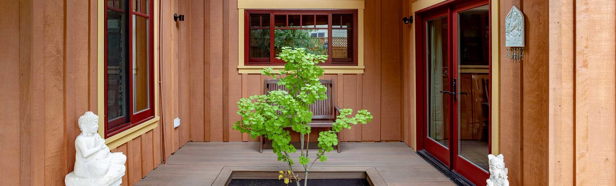 It’s not everyday we get to work with a client who’s also a master sculptor and carver. When he mentioned that he would like to carve some of the beams and doors in the project, we were delighted! The owners are moving back into town and they want to fix this place up to be their “retirement home.” The main design thrust was to give the 1945 house a new lease on life, a well-needed fresh start to complement and enhance it’s good ol’ bones. To start, we added an open and airy carport with a mudroom connector; a new laundry room; an office; a new kitchen; a new front, covered porch; and a new, vaulted living room with clerestory windows and a wrap-around exterior veranda for easy access to and from the ample yard and garden. Home Sweet Home! Plus, an 800 SF ADU (Accessory Dwelling Unit) with artist workshop off the alley was added to bookend the beautiful garden.